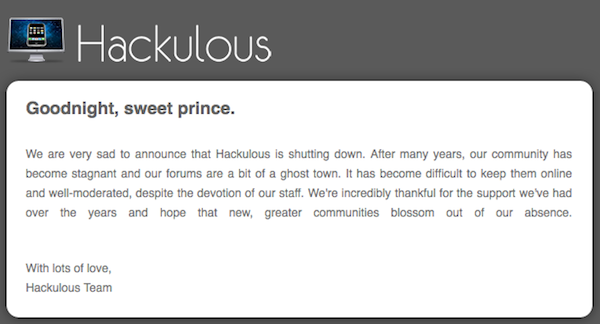 We are very sad to announce that Hackulous is shutting down. After many years, our community has become stagnant and our forums are a bit of a ghost town. It has become difficult to keep them online and well-moderated, despite the devotion of our staff. We’re incredibly thankful for the support we’ve had over the years and hope that new, greater communities blossom out of our absence.